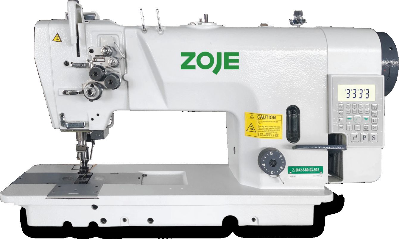 Двухигольная машина с увеличенными челноками без отключения игл для средних и тяжелых материалов с прямым приводом и автоматическими функциями обрезки нитей, закрепки и позиционера игл.