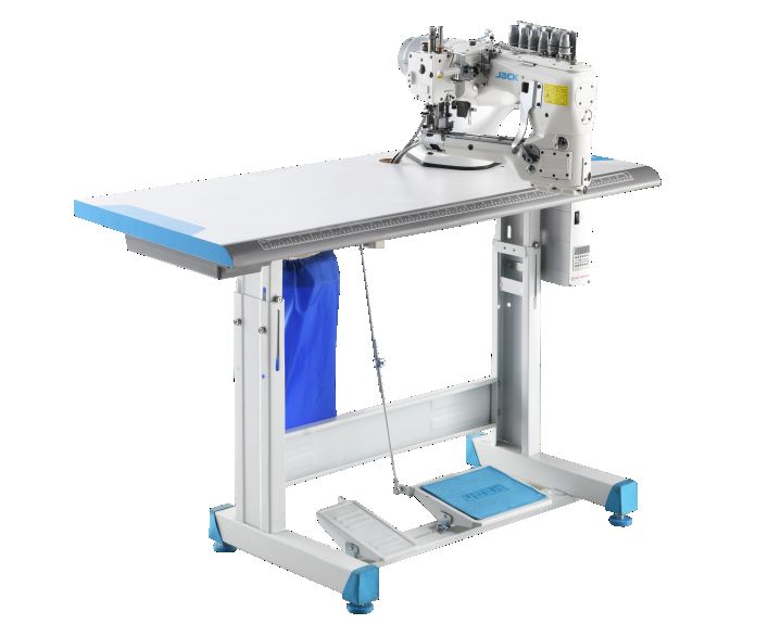 Четырехигольная машина для сшивания материалов в стык с прямым приводом и автоматическими функциями обрезки нитей, подъема лапки и отсоса обрези. Длина окружности 150мм. Два ножа обрезки.